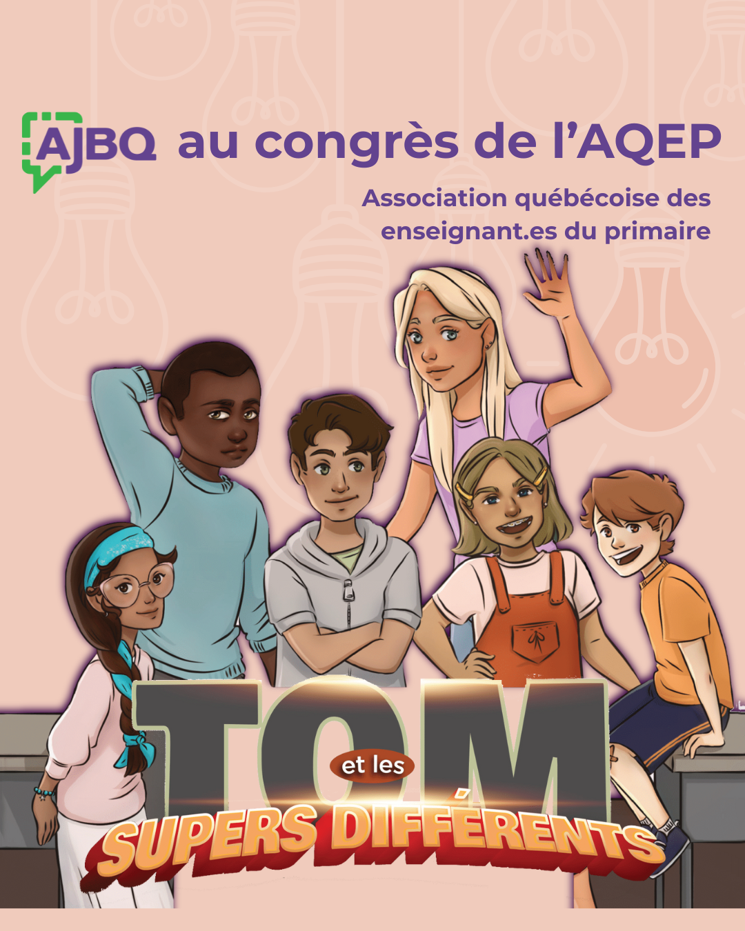 L'AJBQ sera au kiosque #6 du Congrès de l'Association des enseignant.es du primaire pour présenter ses outils et services. C'est une occasion en or de découvrir l'atelier gratuit clé en main Tom et les Super Différents sur la sensibilisation à la différence et la lutte contre l'intimidation, ainsi que nos ressources adaptées au milieu scolaire.