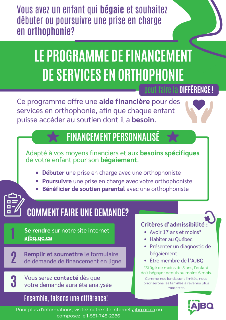 L’AJBQ est fière de soutenir les enfants qui bégaient et leur famille grâce à son programme de financement de services en orthophonie. Sachant que l’accessibilité aux services en orthophonie peut représenter un défi pour plusieurs, ce programme vise à faciliter cet accès en offrant une aide financière adaptée aux besoins et à la situation de chaque famille.